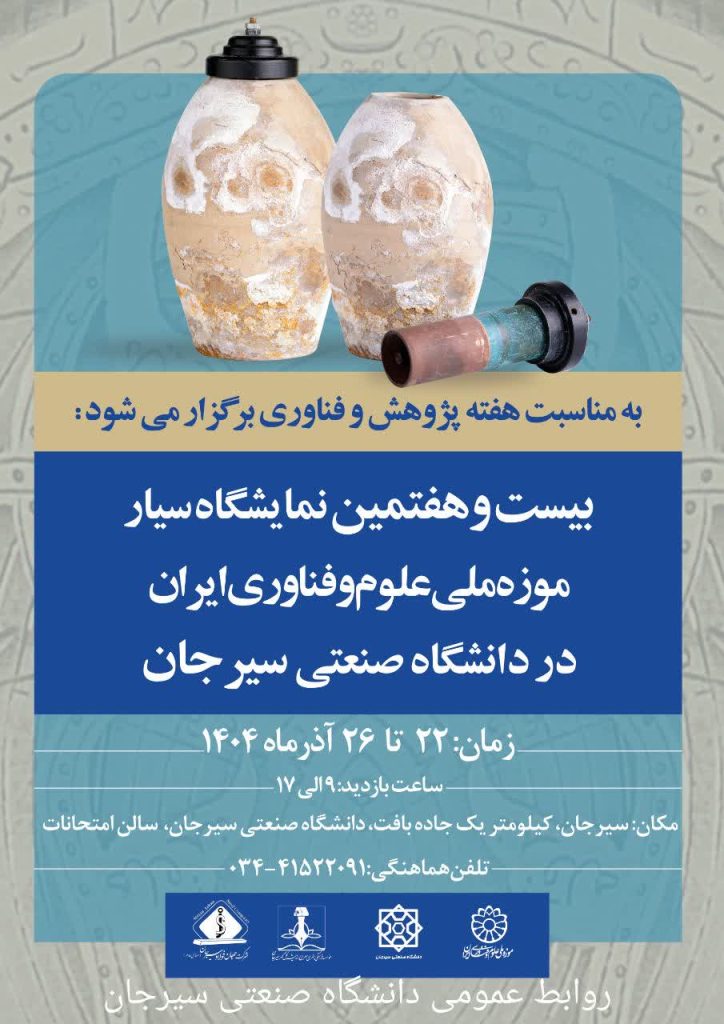 ✍️ به گزارش روابط عمومی دانشگاه، به همت دانشگاه صنعتی سیرجان و همکاری موسسه معراج اندیشه گل گهر، نمایشگاه سیار موزه ملی علوم و فناوری ایران همزمان با فرارسیدن هفته پژوهش و فناوری از تاریخ 1404/09/22 تا1404/09/26برگزار خواهد شد.