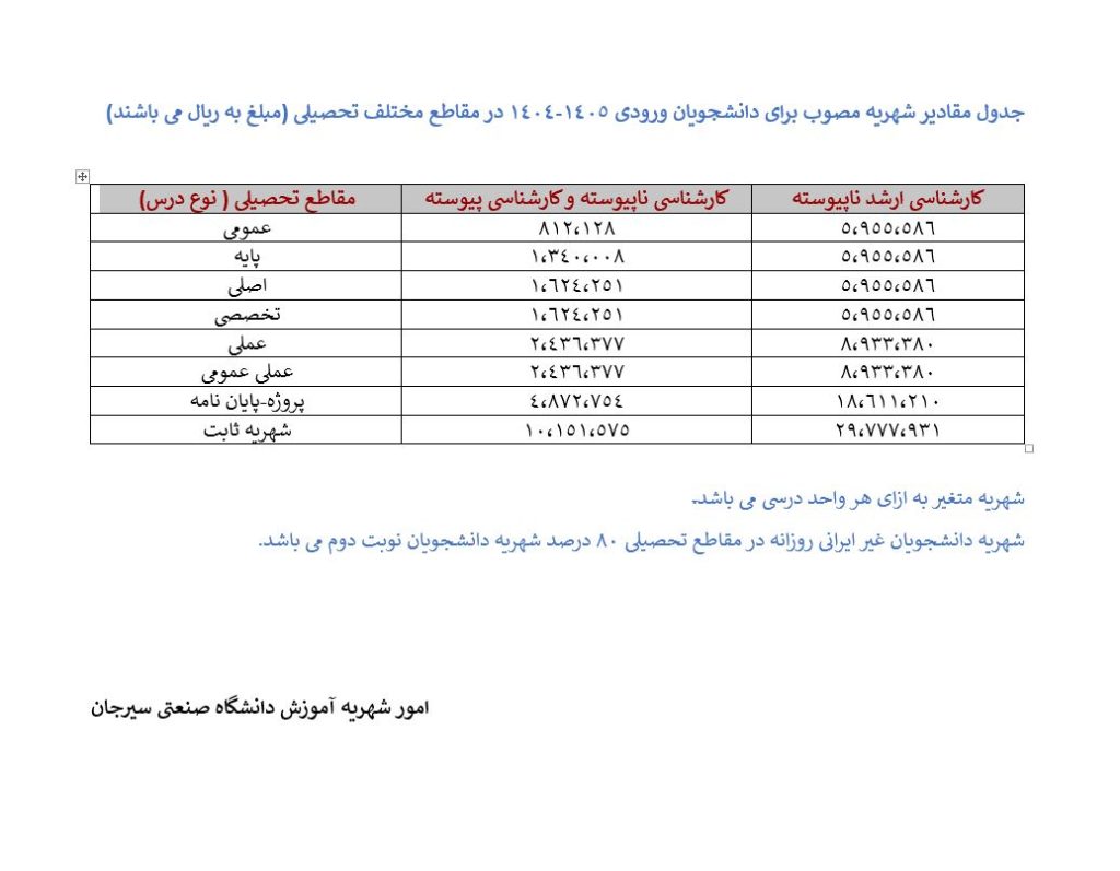 میزان شهریه مصوب برای دانشجویان ورودی 1405-1404 در مقاطع مختلف تحصیلی
